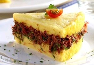Molho: Colocar em uma panela, o oleo, refogar a cebola, o bacon, a carne seca, adicionar o molho de tomate, a salsinha, o sal, a pimenta e a azeitonas. Em um refratário, coloque a polenta, despeje o molho por cima e cubra com a mussarela. Leve ao forno para gratinar.