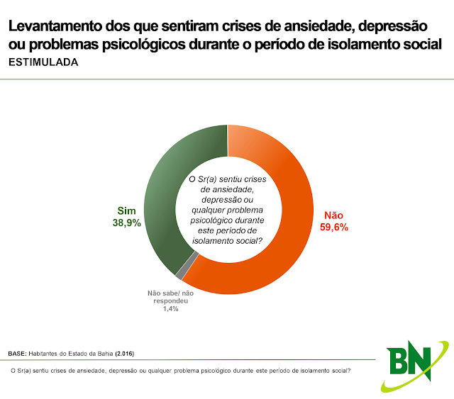 O isolamento social interferiu no psicológico de 38,9% dos baianos, que relataram ter tido crises de ansiedade, depressão e outros problemas do tipo em meio à pandemia. O dado consta em um levantamento realizado pelo Instituto Paraná Pesquisas em parceria com o Bahia Notícias.