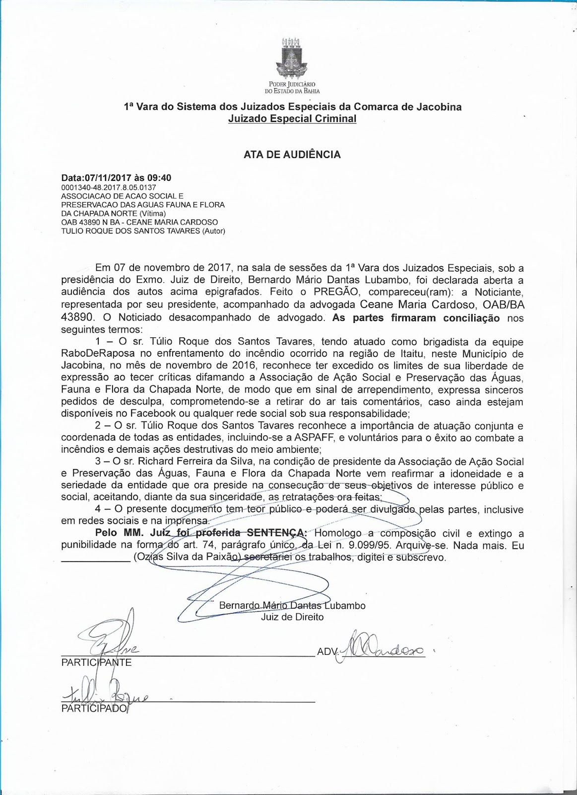 Para conhecimento: Ata de audiência na 1a. Vara do Sistema dos Juizados Especiais da Comarca de Jacobina, Juizado Especial Criminal.
