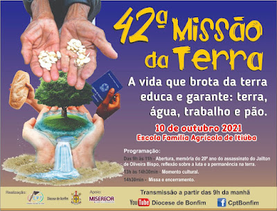 Em vista da pandemia do novo coronavírus, a Comissão Pastoral da Terra, com outros parceiros avaliaram ser prudente permanecer a 42ª Missão da Terra virtualmente devido o cenário atual, que será realizada no dia 10 de outubro, na escola família Agrícola de Itiúba. O tema escolhido foi “A vida que brota da terra educa e garante: terra, água, trabalho e pão” e o lema: “Quero ver o direito brotar como fonte e correr a justiça qual riacho que não seca” (Am 5, 24).