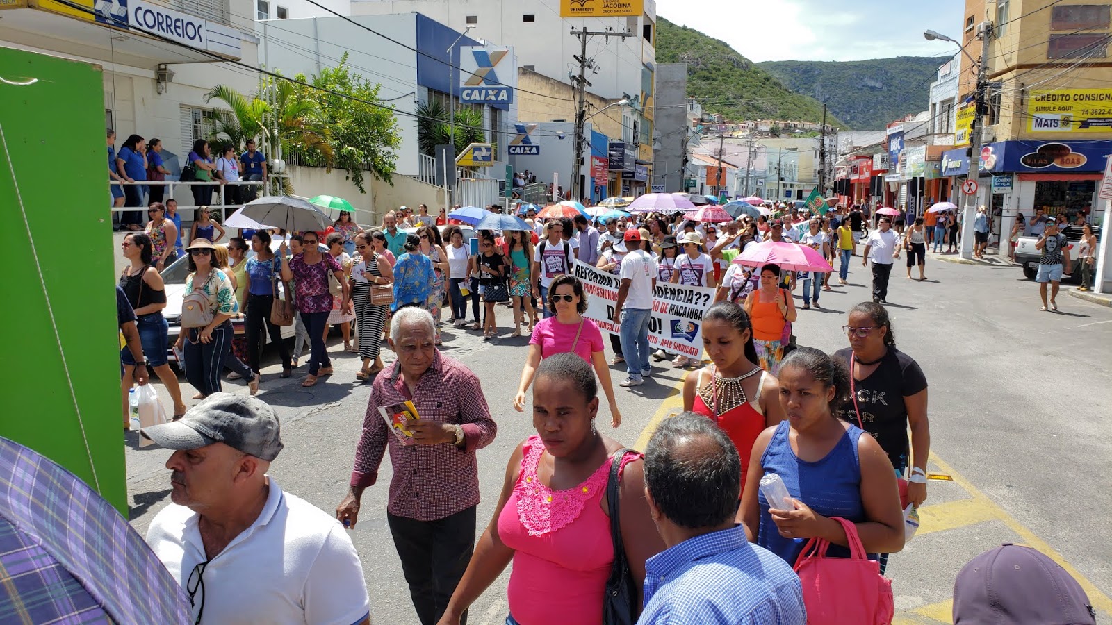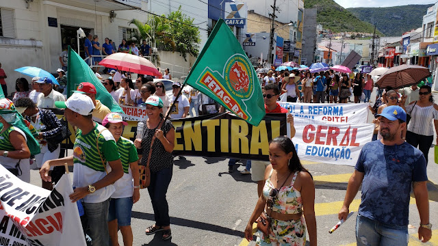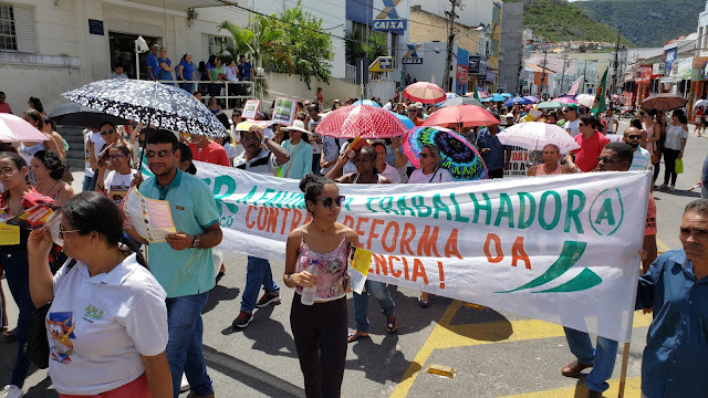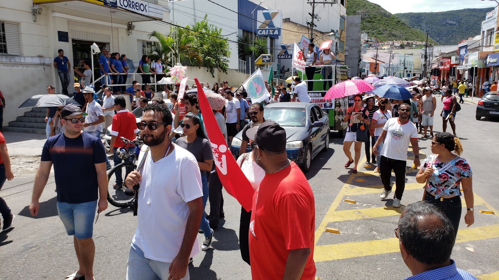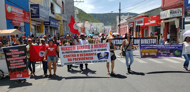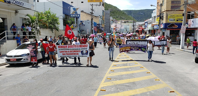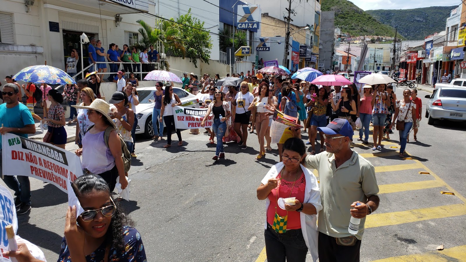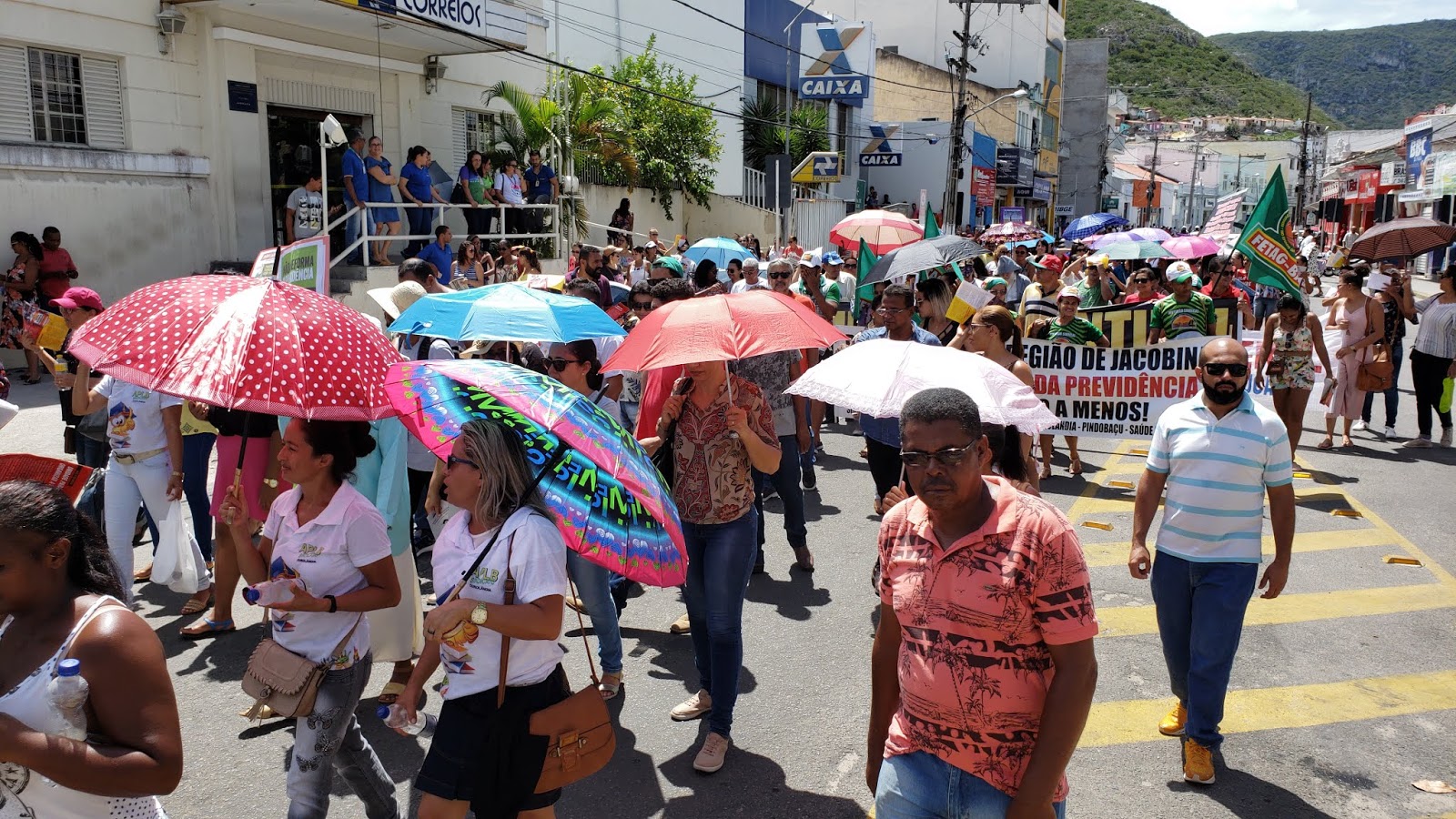 Na manhã desta sexta-feira, 22 de março de 2019, uma manifestação contra a Reforma da Previdência segue pelas ruas da cidade de Jacobina.