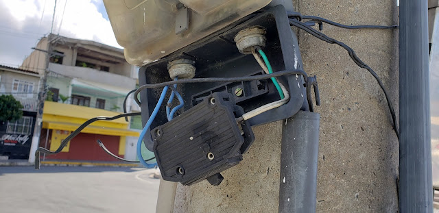 A jovem pede manutenção em um padrão de energia elétrica que apresenta fios expostos, podendo causar acidentes.