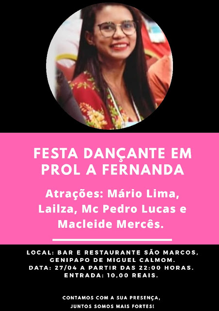 Próximo sábado, 27 de abril de 2019, vários artistas estarão reunidos em uma festa beneficente para a jovem Fernanda Carvalho, 22 anos, que luta contra um câncer.