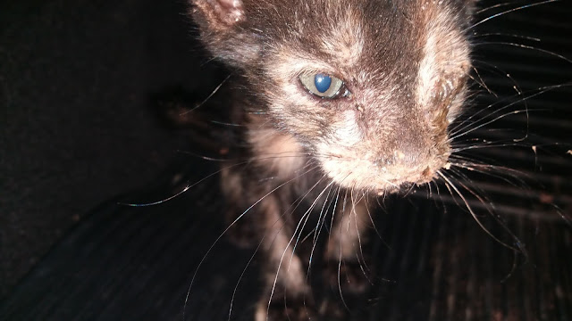 Bastante debilitado, praticamente cego de um olho, com rabujo, o gatinho foi resgatado na cidade da cidade e segue sendo guiado para um vida mais digna confortável.