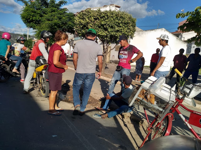 Um ciclista ficou ferido em uma colisão entre sua bicicleta e uma moto próximo a rodoviária de Jacobina na tarde desta sexta-feira, 3 de maio. Na batida, de circunstâncias desconhecidas, o ciclista cortou o pé. A bicicleta é do tipo cargueiro e estava com uma estufa cheia de salgados. Os vidros da estufa se quebraram com o impacto. O motociclista está no local e presta suporte ao rapaz da bicicleta neste momento mas ele não quis receber atendimento médico alegando que o corte no pé é superficial.