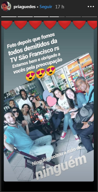 Também nos stories, Guedes divulgou um registro feito entre os colegas da TV São Francisco que foram demitidos. De acordo com informações iniciais, ao menos 16 profissionais foram dispensados da sucursal. “Foto depois que fomos todos demitidos da TV São Francisco rs. Estamos bem e obrigado a vocês pela preocupação. Ninguém soltou a mão de ninguém”, publicou.