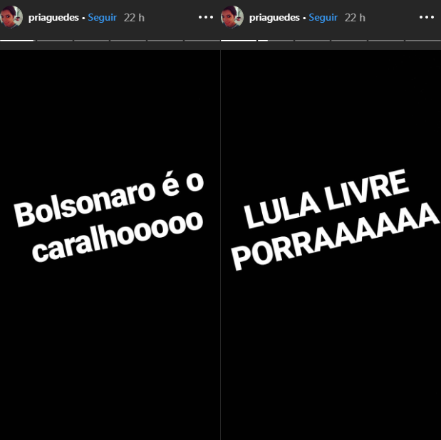 “Bolsonaro é o car**ho [...] Lula livre porr*”, postou a jornalista em seus stories. Além disso, Guedes publicou em seu perfil uma foto de Lula acompanhada da hashtag “Lulalivre”. Vale lembrar que enquanto esteve empregada pela Rede Bahia, afiliada da Globo no estado, Priscilla não poderia se pronunciar politicamente conforme estabelecem os princípios editoriais do grupo.