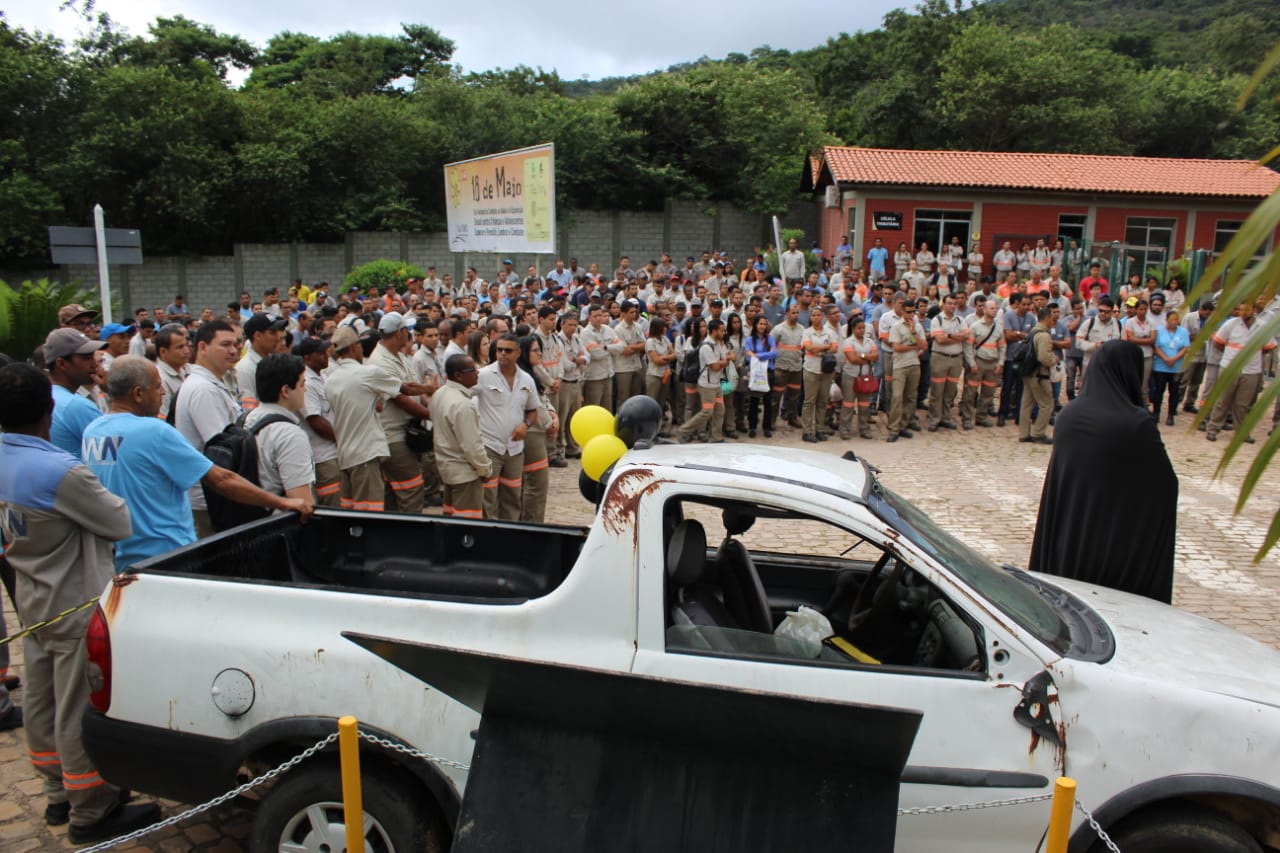 Nesta semana a Jacobina Mineração e Comércio (JMC) concluiu sua programação de adesão ao Maio Amarelo, promovendo uma ação interna de Diálogo Diário de Segurança (DDS). Na atividade foram utilizados veículos envolvidos em acidentes, cedidos pela Polícia Rodoviária Estadual. O objetivo foi alertar aos colaboradores sobre os perigos que estão por trás das escolhas que contrariam as regras em nome de ganhar poucos segundos até o destino final. “A intenção da campanha não é aplicar uma ação punitiva, e sim orientar os colaboradores para elevar o nível de responsabilidade com o trânsito. Dessa forma contribuímos com uma atuação segura dentro e fora da empresa”, observa Adriano José Francisco, coordenador de Saúde, Segurança e Meio Ambiente da JMC.