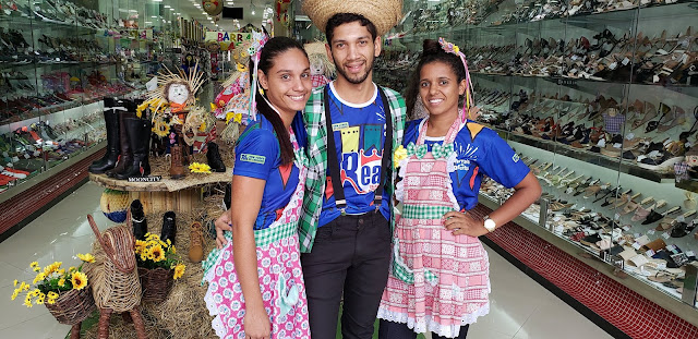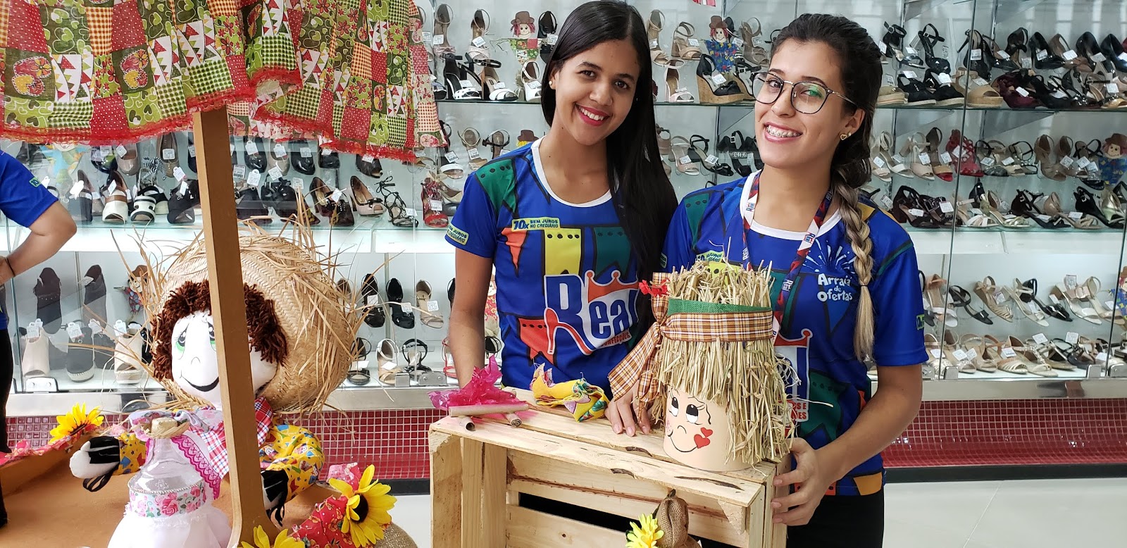 As jovens atendem na Real Calçados, que tem três lojas para lhe atender com o Arraiá de Ofertas.