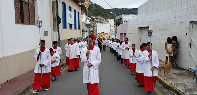 Final da tarde de segunda-feira, 10 de junho de 2019, e pelas ruas de Jacobina, pessoas seguem na Procissão de São Benedito.