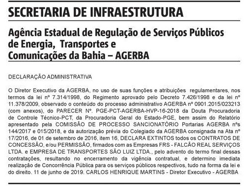 As Empresas de trasporte São Luiz e Falcão Real tiveram suas respectivas concessões para operar linhas de ônibus interestaduais na Bahia revogadas. A informação veio através de publicação no site da SEINFRA.