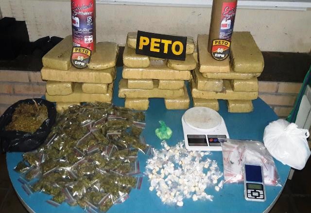 Os policiais seguiram em direção ao local por onde eles fugiram e encontraram, dentro das taboas: 31 tabletes de maconha ; 91 papelotes de cocaína; 01 porção grande a granel de cocaína pesando cerca de 40g; 01 porção grande a granel de maconha pesando cerca de 800g;180 porções separadas para venda de maconha; 02 balanças de precisão; 10 rolos de fita adesiva; Diversas embalagens plásticas para acondicionar droga.
