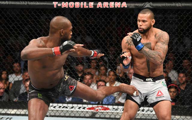 Jones dominou o centro do octógono durante todo o tempo, mas foi tocado várias vezes por Marreta. Os golpes do brasileiro chegaram a assustar, mas não foram suficientes para derrubar o campeão. Thiago também pareceu ter sentido uma lesão na perna que dificultou ainda mais a missão que já era quase impossível.