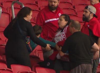 Uma torcedora do Grêmio, acompanhada de uma criança, foi agredida após o Gre-Nal, disputado na noite do último sábado (20), no Beira-Rio, em Porto Alegre (RS). Depois da partida, que terminou empatada em 1 a 1, a mulher retirou uma camisa do Tricolor Gaúcho e comemorou o resultado em um setor destinado à torcida do Inter. Alguns colorados e tentaram arrancar a camisa de suas mãos, enquanto o menino chorava e tentava não perder a vestimenta. As imagens foram captadas pelo SporTV.