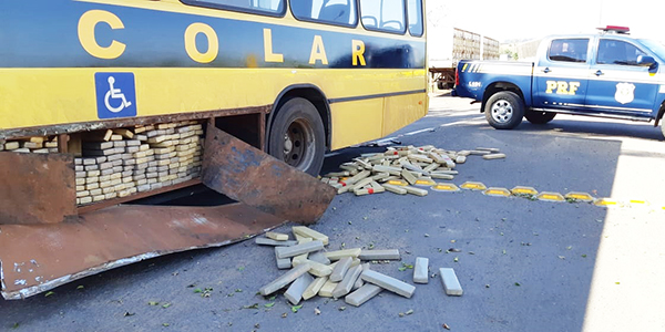 A Polícia Rodoviária Federal (PRF) apreendeu um ônibus com 933,8 quilos de maconha em Alto Paraíso, na região noroeste do Paraná. A droga estava escondida dentro de um compartimento do veículo, que foi pintado e adesivado para parecer um ônibus escolar. Por meio do número da placa, a PRF descobriu que o veículo, na verdade, pertence a uma empresa privada de transporte coletivo.