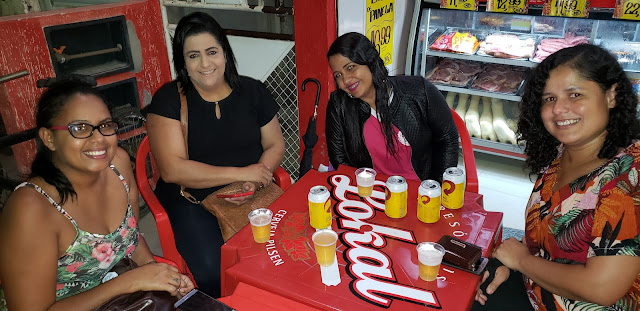 A terceira na foto é a Joyce Sena, que toma uma cervejinha com amigas, ouvindo um sozinho, após mais um dia de trabalho no comércio local.