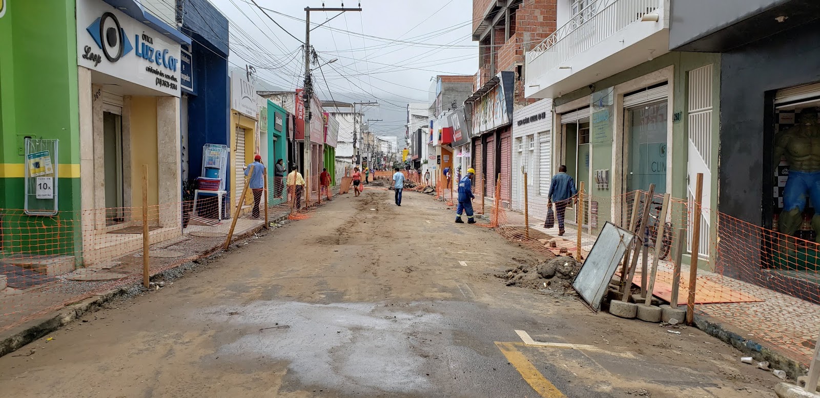 A via foi fechada e homens trabalham na requalificação da rua, que fará parte da ampliação do Calçadão, que ganhará o nome do saudosos ex-prefeito Carlito Daltro.