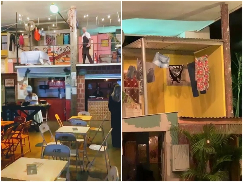 Dentro de um cenário descrito na legenda do vídeo como "casa de favela", uma garrafa de refrigerante vazia repousa sobra a pia. Junto ao varal, há um isopor em que está escrito "juju", suco de fruta congelado também chamado de geladinho ou sacolé.
