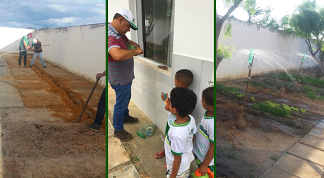 Depois da excelente repercussão da projeto em Caatinga do Moura, agora foi a vez de implantar a horta escolar na CMEI Cristina Sena, no Bairro Vila Feliz. Com um sistema de irrigação diferente, utilizando a tecnologia da microaspersão, reutilizando garrafas pets, mostramos que é possível inovar e reduzir a agressão ao meio ambiente.