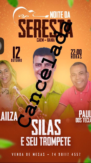A festa Noite da Seresta que seria realizado neste sábado, 12 de outubro de 2019, no Clube Social em Caém, foi cancelado, devido ao falecimento da senhora Ester Fernandes Matos, 87 anos, mãe do prefeito Gilberto Matos.