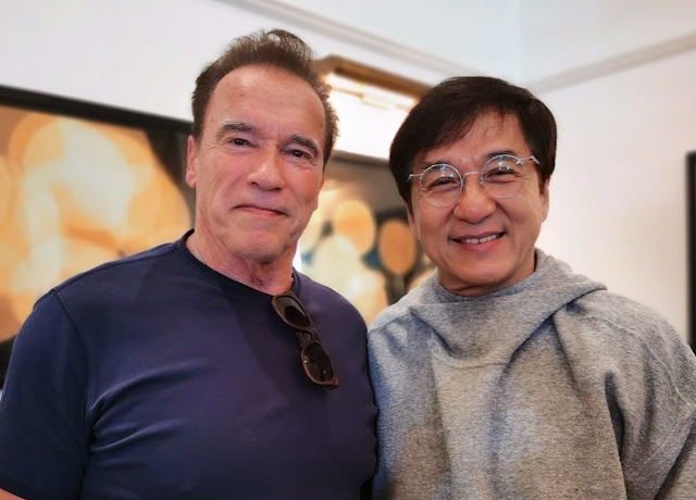 "Foi fantástico encontrar meu velho amigo e um herói que tenho, Jackie Chan, quando voltei da turnê mundial de O Exterminador do Futuro. Uma lenda e uma inspiração", escreveu na legenda.