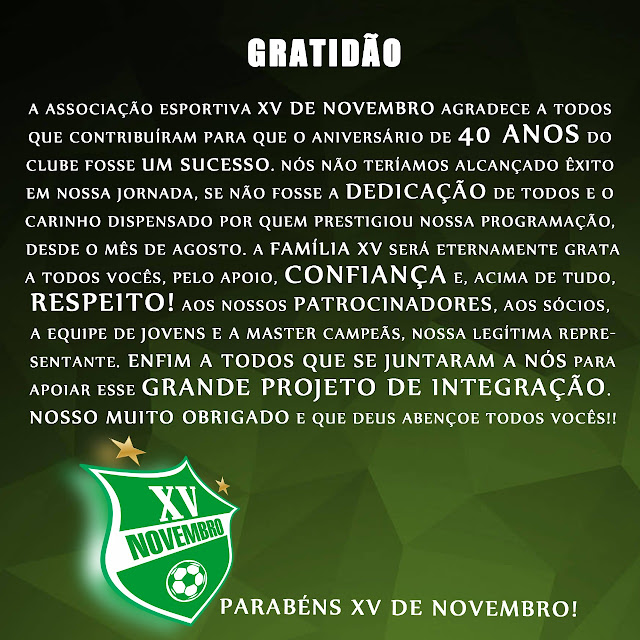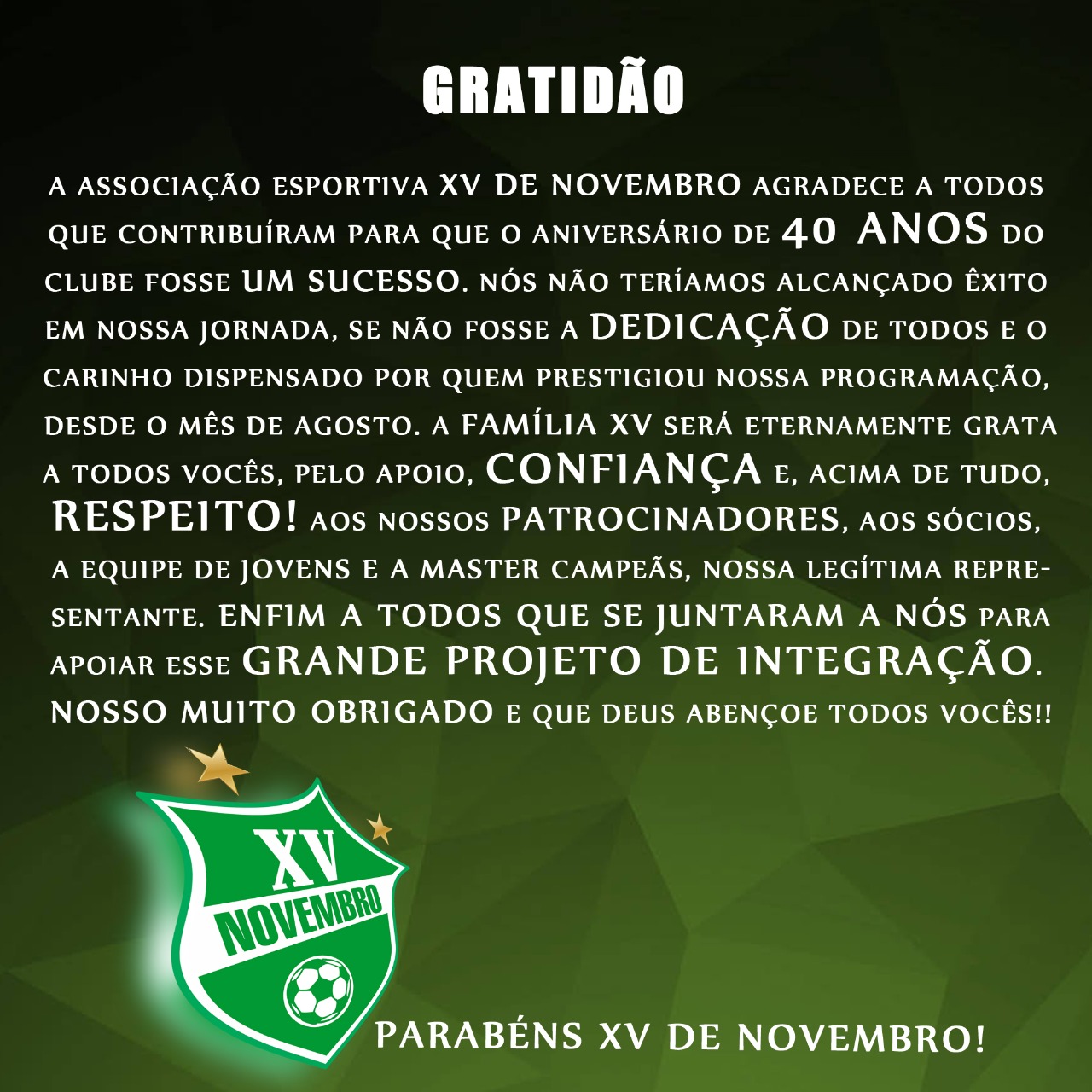 Equipe XV de Novembro agradece a todos que contribuíram com o evento de aniversário de 40 anos do clube