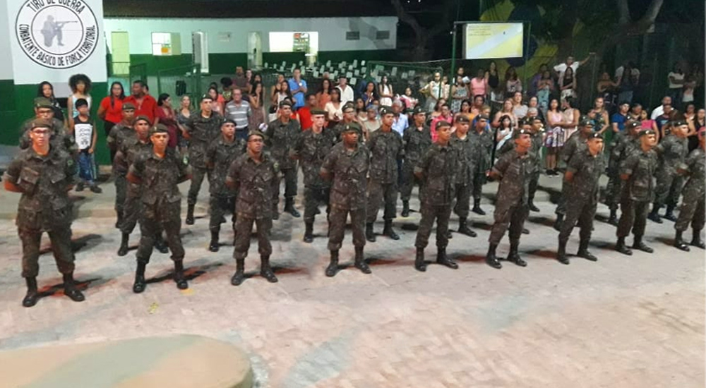 Na noite desta sexta-feira, 29, o Tiro de Guerra 06-008/Jacobina, sob o comando do Subtenente Fagundes, realizou a formatura militar dos atiradores do ano 2019. A turma, denominada Tenente EB Lima, homenageou a família do Tenente em comento com a entrega de um buquê de rosas à sua viúva, que foi realizada pela Cap PM Virgínia, Comandante da 2ª Cia PRv/ BPRv, que estava