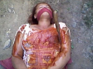 Os dois encenaram tudo usando um pote de ketchup, uma mordaça e uma faca. Como prova de que o crime havia sido consumado, Carlos Roberto tirou uma fotografia da “morta” e entregou à mandante. A mulher acreditou na foto, apesar da montagem grotesca com a faca “encravada” debaixo da axila de Erenildes, que aparece na imagem amordaçada e o corpo labreado com o condimento. Maria Nilza então pagou R$ 1 mil a Carlos Roberto, que dividiu o dinheiro com Lupita.