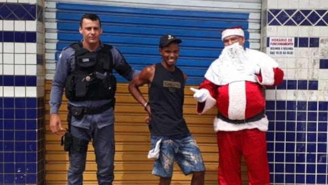 Policial fantasiado de Papai Noel prende acusado durante entrega de presentes