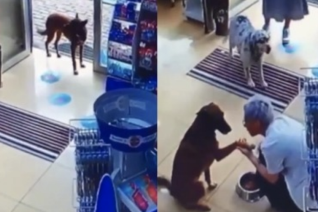 Pensando que o bichinho estava com fome, ela oferece um pote de comida dentro da loja, mas logo percebe o problema: um corte na pata. Imagens registradas na semana passada, mostram o momento em que a cadela entra na farmácia e estende a patinha.