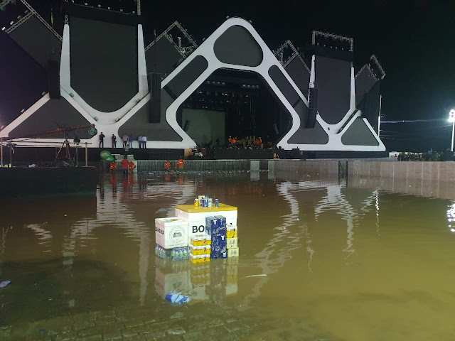 Já chovia quando o cantor Gustavo Lima se apresentava. O show estava previsto para encerrar às 23h30, mas finalizou às 23h50 e, em seguida, houve uma pausa de cerca de duas horas. Os equipamentos foram desligados até às 2h da madrugada, quando o DJ Alok começou a se apresentar.