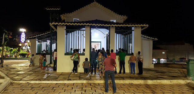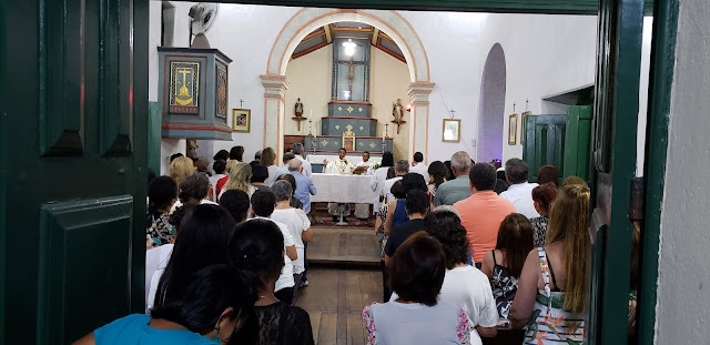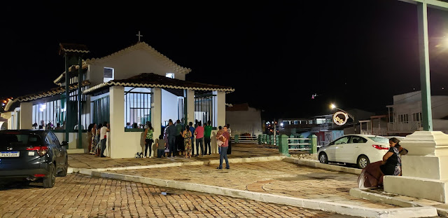 Noite de quarta-feira, 01 de janeiro de 2020, e aqui no Alto da Missão em Jacobina, pessoas acompanham missa na Igreja Bom Jesus da Glória.