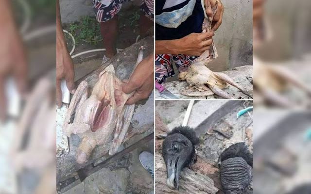 Nas imagens, é possível ver as aves sendo depenadas e as cabeças ao lado. A carne do urubu estaria sendo vendida ao preço “promocional” de R$ 5 o quilo.