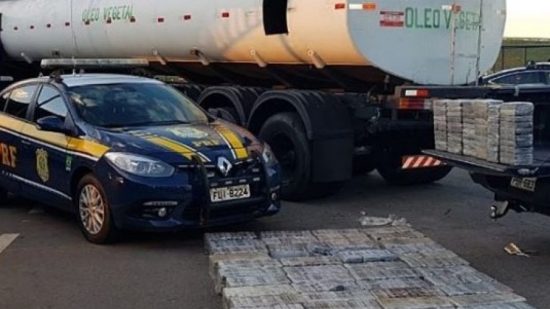 Ainda segundo a PRF, a apreensão ocorreu após os policiais suspeitarem do nervosismo do condutor de um caminhão tanque durante uma abordagem.