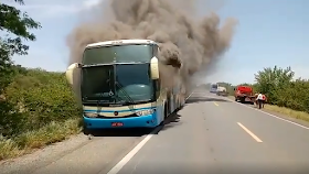 Um ônibus da Viação Novo Horizonte pegou fogo na manhã deste sábado, 18 de Janeiro de 2020, na BR 242, próximo ao povoado de Beira Rio, município de Oliveira dos Brejinhos.