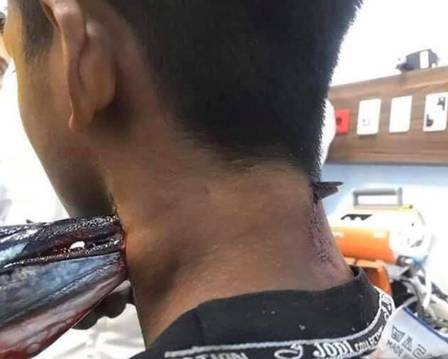 O adolescente Muhammad Idul ficou ferido quando um peixe-agulha saltou da água e ficou cravado no pescoço do jovem de 16 anos.