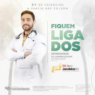 Dr. Leandro Oliveira (Nefrologista) vai estar dia 07/02 Sexta-feira na Rádio JACOBINA FM 99.1, a partir dàs 12:30h falando sobre: Nefrologia e muito mais sobre saúde! Sintonize e acompanhe.