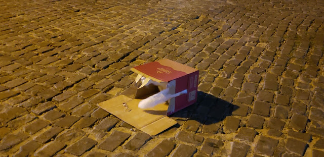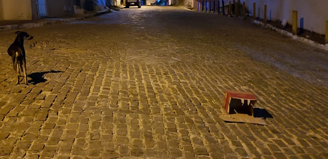 Pouco antes a ventania arrastou uma caixa pra rua. Um cachorro foi visto próximo e Pipoca acabou entrando dentro da caixa e por pouco não foi atropelado por um carro que passou no local.