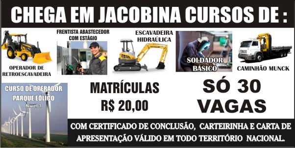 Atenção você de Jacobina e região! Se você deseja trabalhar em: mineradoras, construção civil, parque eólico, postos de combustíveis, serralheria e outros, não percam esta grande oportunidade! Qualifique-se já nas áreas que mais empregam em nossa região.