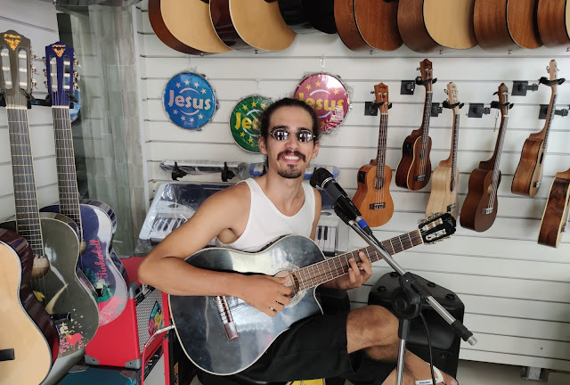 O jovem que canta e toca violão, dar uma palinha com sua bela voz testando um novo instrumento, chamando a atenção de quem passa pela rua.