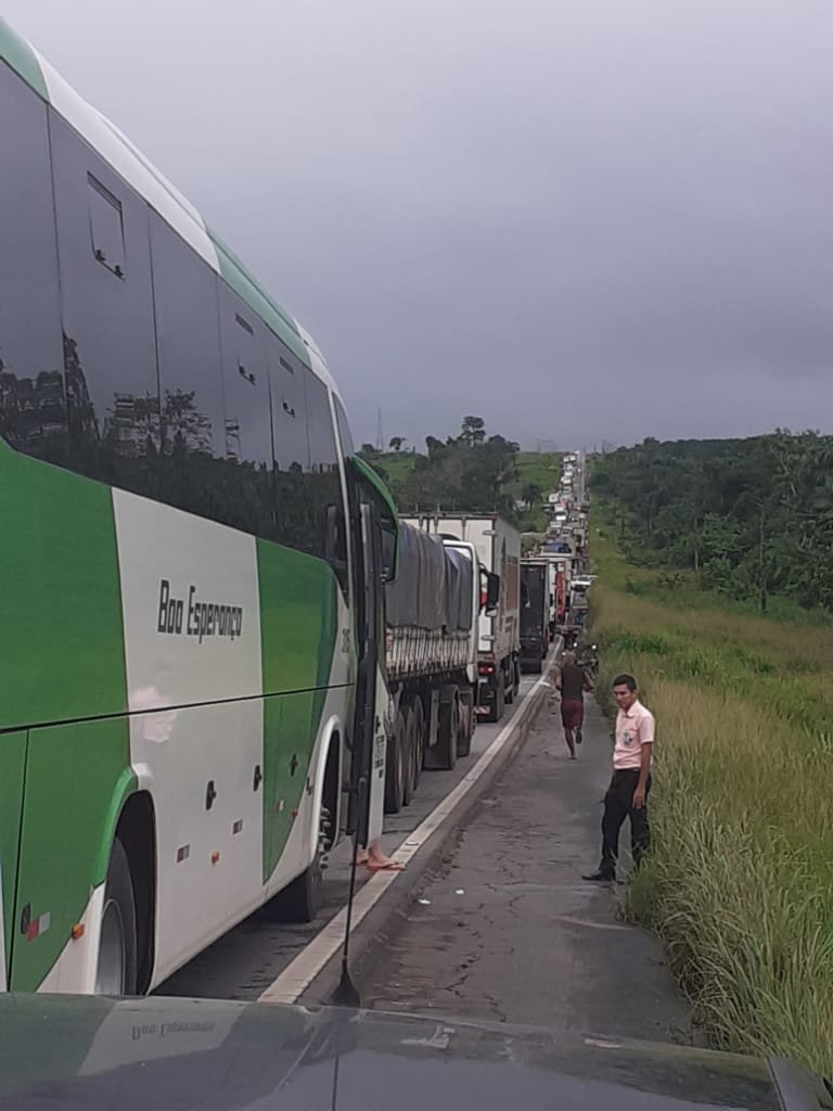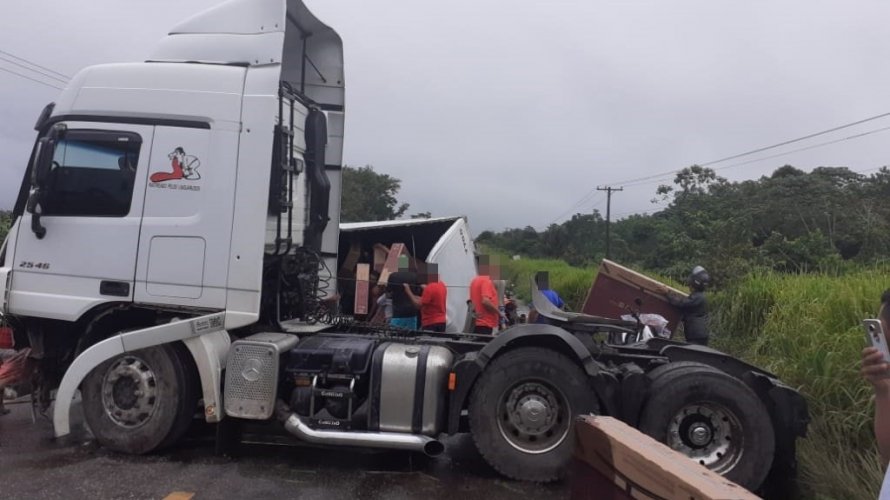Segundo os policiais, o veículo carregado de aparelhos de 50" e 55" saiu de uma fábrica em Manaus com destino à São Paulo.Em um dos trechos da estrada, o condutor perdeu o controle do veículo e tombou a carreta.