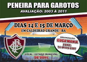 Próximo sábado e domingo da, 14 e 15 de março de 2020, vai ser realizada a Peneira do Fluminense do Rio de Janeiro, para garotos nascidos entre 2003 e 2011, na cidade de Caldeirão Grande-BA.