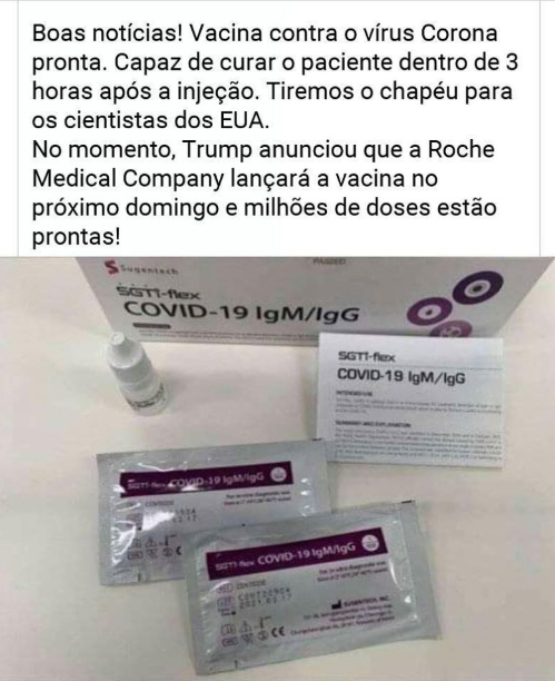 “Boas notícias! Vacina contra o vírus Corona (sic) pronta. Capaz de curar o paciente dentro de 3 horas após a injeção. Tiremos o chapéu para os cientistas dos EUA.