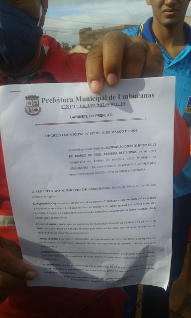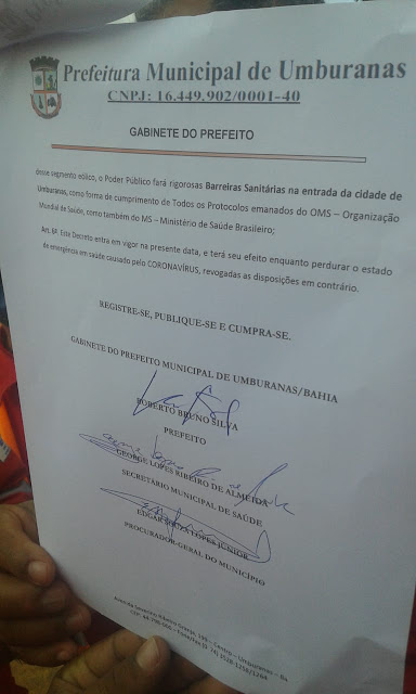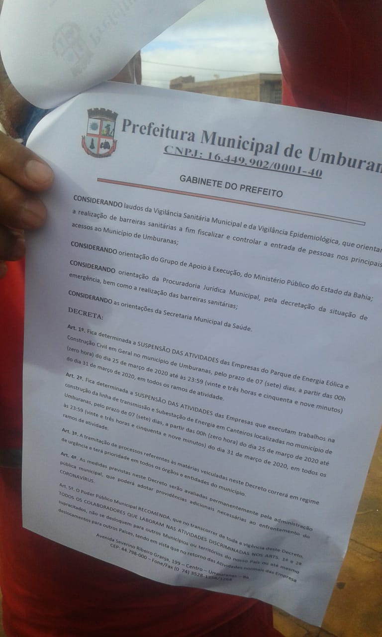 Na manhã desta quarta-feira, 25 de março de 2020, o prefeito Roberto Bruno determinou através de decreto a suspensão das atividades das empresas de energia eólica no município de Umburanas, como medida preventiva ao Covid-19, o novo Coronavírus.