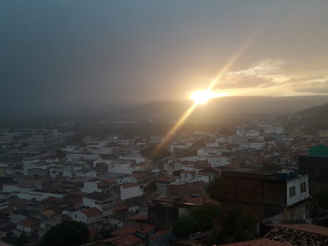 Final da tarde de domingo, 28 de março de 2020, e do Bairro da Caixa D'água em Jacobina, o Crispim Pereira fez uma foto que mostra a chuva e a despedida do sol da Cidade do Ouro.