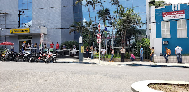 Na agência Banco do Brasil, percebemos pessoas obedecendo as medidas preventivas de distanciamento, para evitar a propagação do Coronavírus. Já no Banco Itaú, as pessoas estão aglomeradas, não dando tanta importâncias para as recomendações.