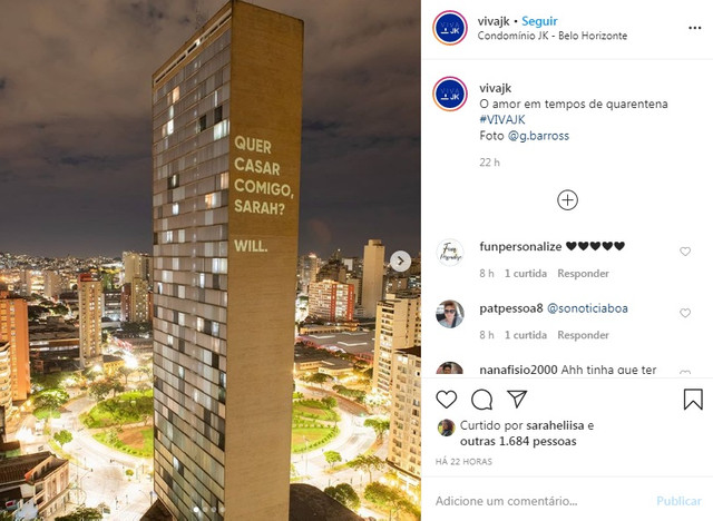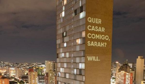 Através do coletivo Viva JK, o jovem Wildson Caldeira, conseguiu fazer o pedido, usando uma projeção no prédio em frente onde os dois moravam. "Quer casar comigo, Sarah?", foram as palavras projetadas. "Eu já 'tava' planejando já fazer o pedido de casamento, a gente se casar ainda esse ano... Só que aí, veio o coronavírus e eu não consegui realizar esse pedido. Eu queria que fosse um pedido de casamento criativo, que fosse algo legal", contou Wildson, em entrevista à TV Globo.