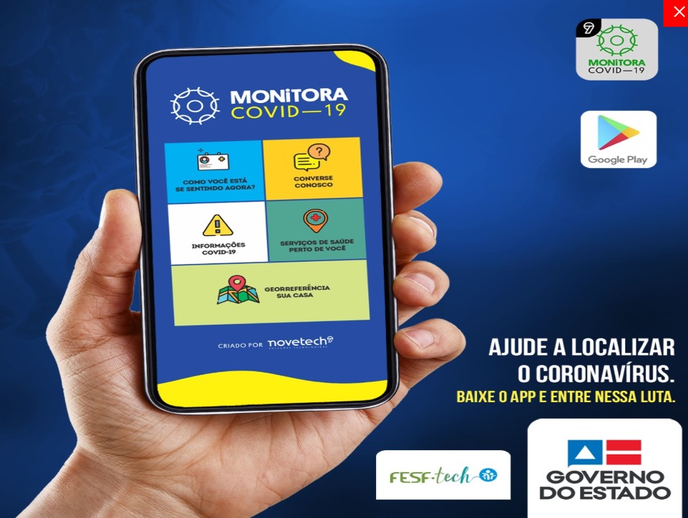 O aplicativo “Monitora” possibilita o registro de informações de pessoas com suspeita da Covid-19, viabilizando o atendimento remoto, monitoramento e acompanhamento dos cidadãos. O app está disponível gratuitamente na plataforma android, sendo, posteriormente, disponibilizado para iOS. Para localizá-lo, é preciso fazer a busca digitando “monitoracovid”, com as duas palavras juntas, e fazer a seleção do aplicativo “Monitora Covid-19”, de cor azul, de autoria do “Governo da Bahia”, ou acessar diretamente este link: https://bit.ly/2UYHR9L.