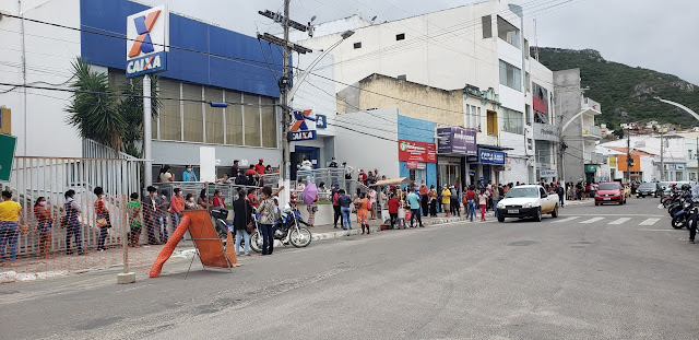 Manhã de sexta-feira, 24 de abril de 2020, e aqui na Rua Senador Pedro Lago em Jacobina, centenas de pessoas seguem em uma fila para a Caixa Econômica Federal.