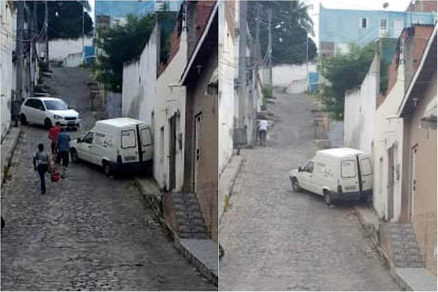Segundo informações, o carro faltou força no motor, não conseguiu subir a ladeira e desceu de ré. Para não descer a ladeira toda e evitar uma tragédia, o motorista decidiu subir o carro na calçada.